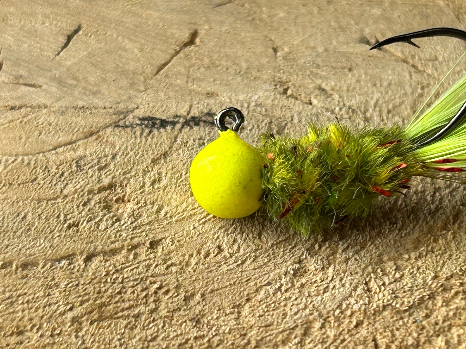Fluorescent yellow ball head 1/8 oz sickle hook #2 or 1/16 oz sickle hook #4 or 1/32 oz sickle hook #6