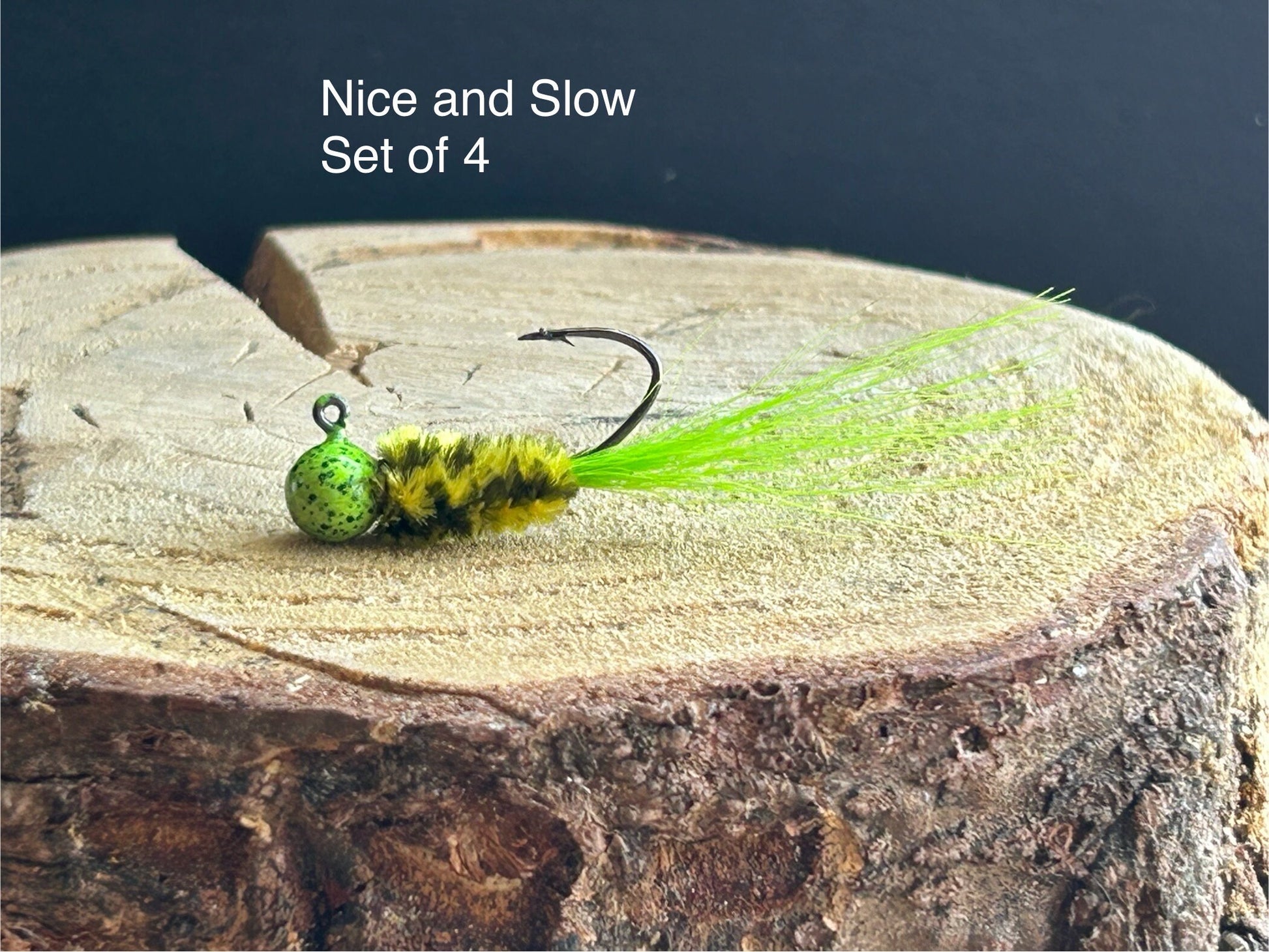 Chartreuse pepper ball head 1/8 oz sickle hook #2 or 1/16 oz hook #4 or 1/32 oz sickle hook #6