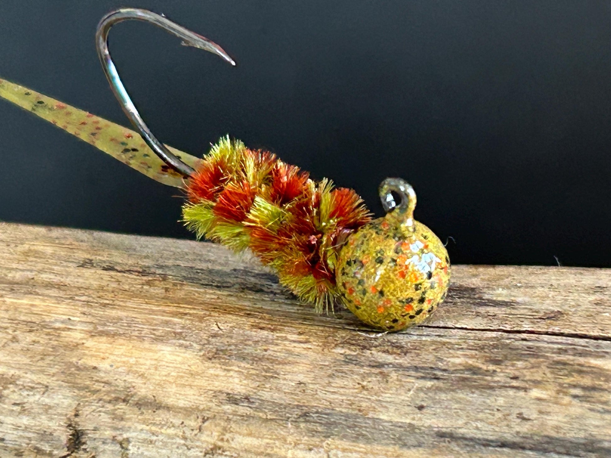 1/8 oz sickle hook #2 or 1/16 oz sickle hook #4 or 1/32 oz sickle hook #6