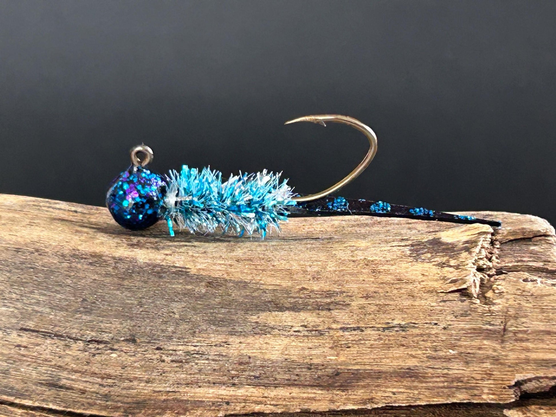 1/8oz sickle hook #2 or 1/16 oz sickle hook #4 or 1/32 oz sickle hook #6