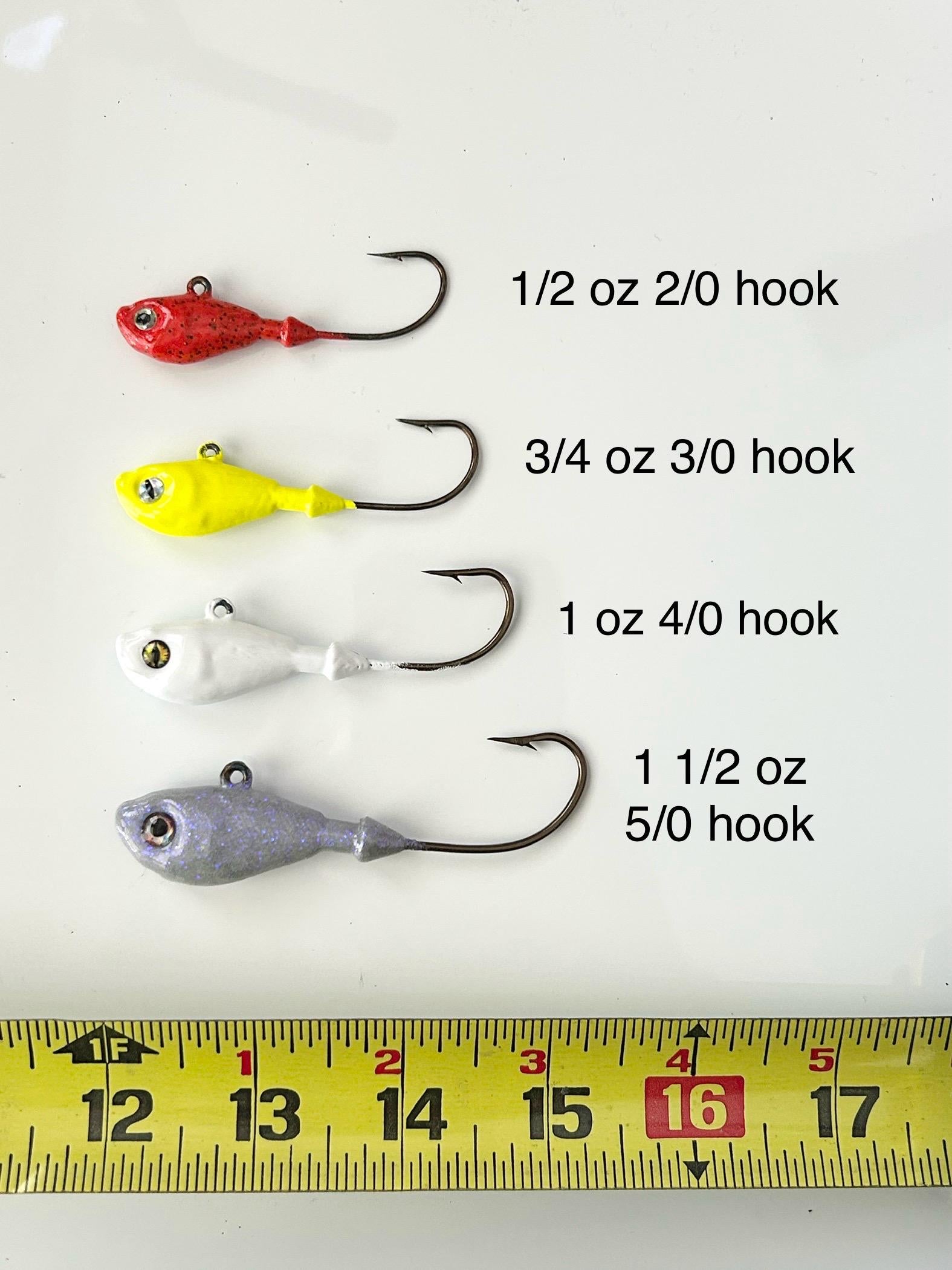 Ultra minnow Size options: 1/2 oz 2/0 hook 3/4 oz 3/0 hook 1 oz 4/0 hook 1 1/2 oz 5/0 hook
